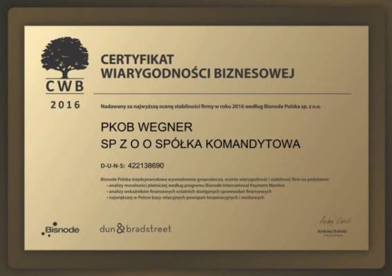 This is an exceptional distinction, because only 1% of companies on the market are in the elite group distinguished by this certificate. PKOB WEGNER has the Bisnode Business Credibility Certificate.